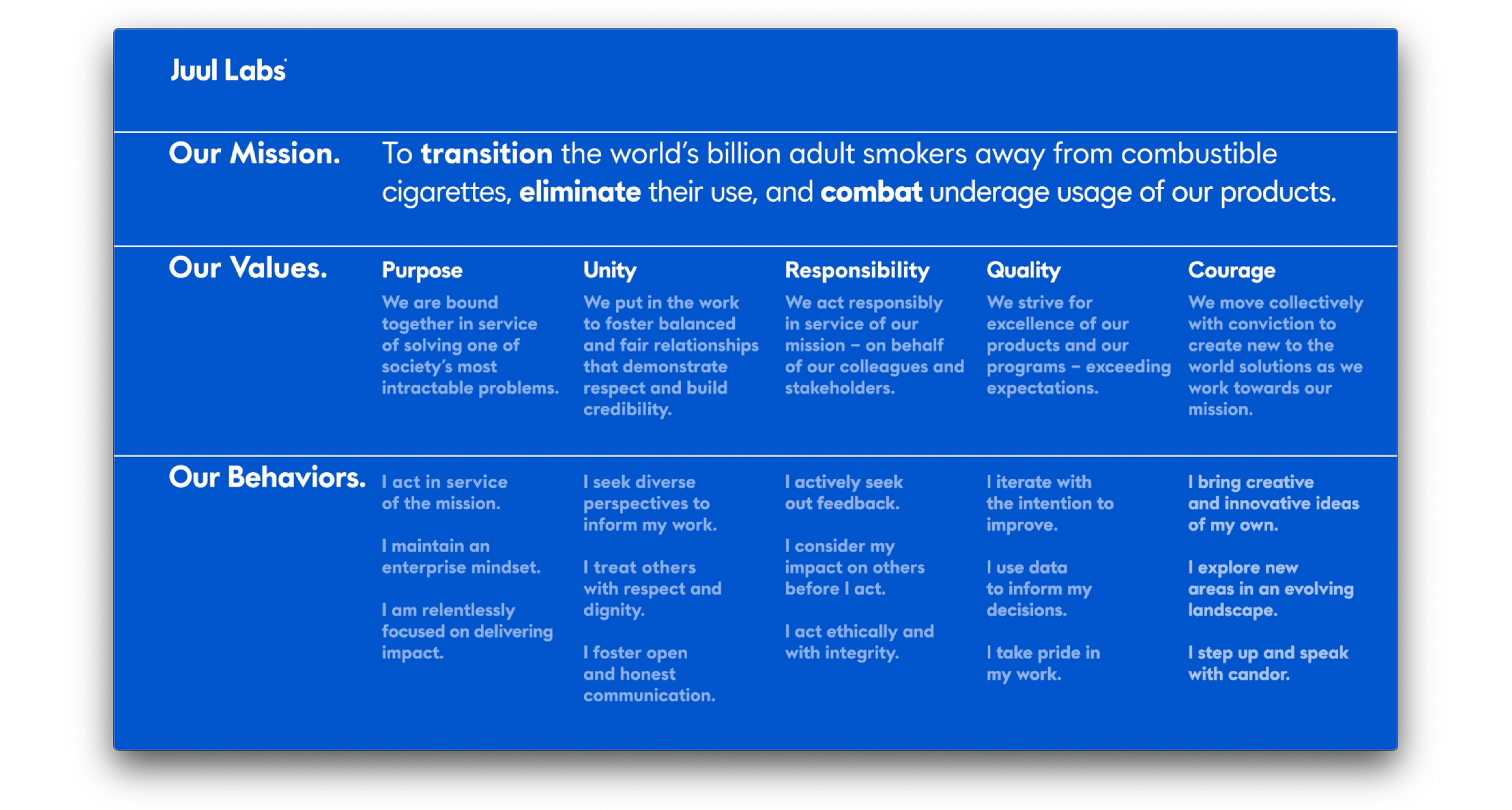 As Juul Labs. Inc. applied for FDA approval with its eye on future product offerings, media attention creates confusion between Juul Labs, Inc. (the company), Juul Labs, Inc. employees, and the JUUL device (the product). Negative media focus splinters the global employee population, bringing rise to the need for a collective sense of belonging.